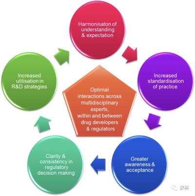 在这方面,如图 1 所强调的,在 MIDD 应用程序的规划、实施、报告和监管审评中实现理解和期望的协调是良性循环的一部分,这应该推动实践的标准化、更高的认识和接受度,进一步明确其在监管决策中的作用,以及在研发战略中的重点利用。