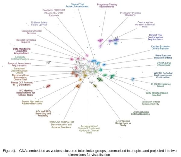 此外,MHRA利用这一机会,对超过11万个GNA进行了全面审查,并将其与现有的指南《临床试验申请中发现的常见问题》进行了对比。结果显示,大多数常见问题与现有指南相符,这相当于验证了AI提取信息的准确性。同时,主题建模还揭示了一些之前未被识别的常见问题,并纳入指南更新。